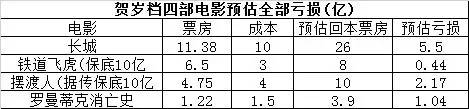 到了贺岁档,被寄予厚望的《长城》、《铁道飞虎》、《摆渡人》、《罗曼蒂克消亡史》部部亏损。