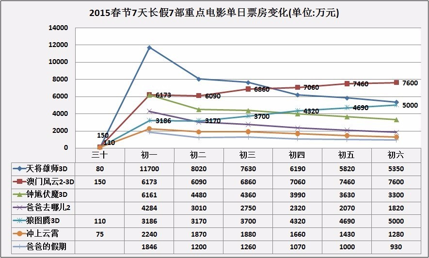 不过,按以往的经验,如果一部片口碑不好,主要也就是在首周末前三天大收一笔,此后跟着口碑下滑排片量和票房自然下滑。口碑好的电影,即使一开始排片量没有那么高,但后续有持久力,会逐日逆袭。比如2015年春节,也是7部热片上映,最后《澳门风云2》和《狼图腾》走了上升曲线,而《天将雄狮》、《钟馗伏魔》等五部片均是逐日下滑。