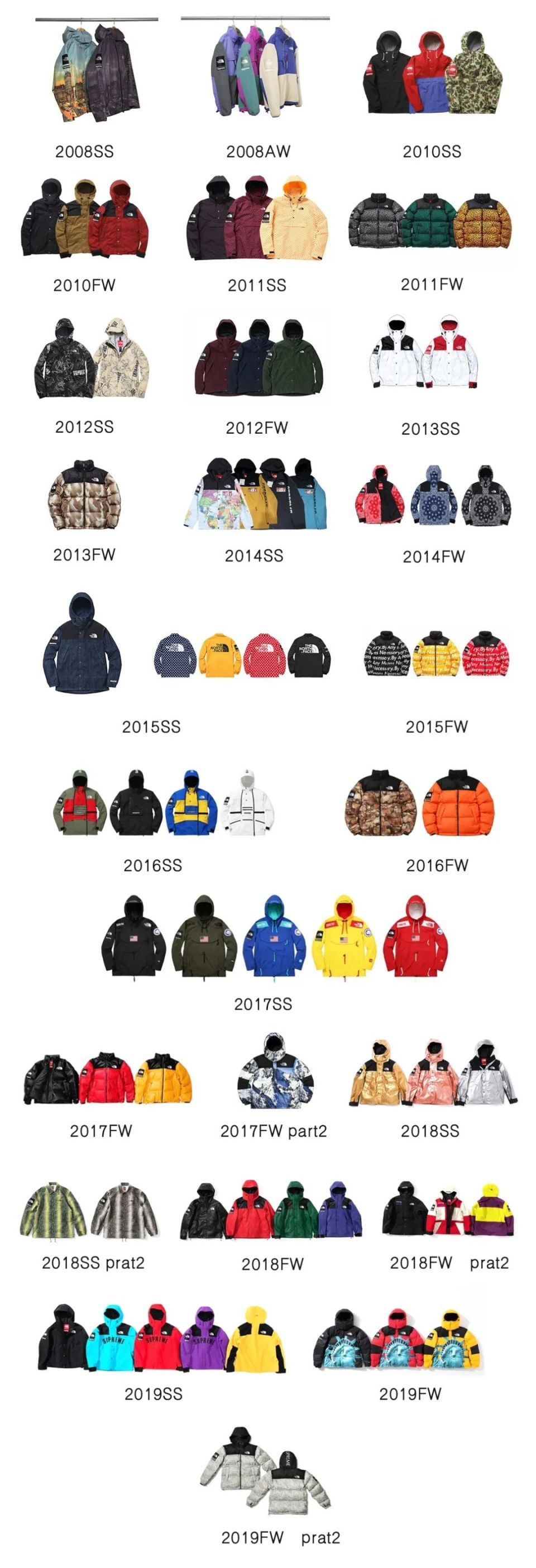 2007年,北面以巅峰系列与潮流街头品牌Supreme发布首款联名,双方开始长达十数年的「蜜月期」。据不完全统计,双方几乎以每年固定1-2款的频率发布联名产品, 多是Supreme以创新的印花图案、面料、制作手法来重新诠释北面的经典产品,如2007年首次合作的 Summit Jacket 使用了双色拼接,2013年使用了3M反光涂层,2017年秋冬推出皮革质地的Nupste夹克等。