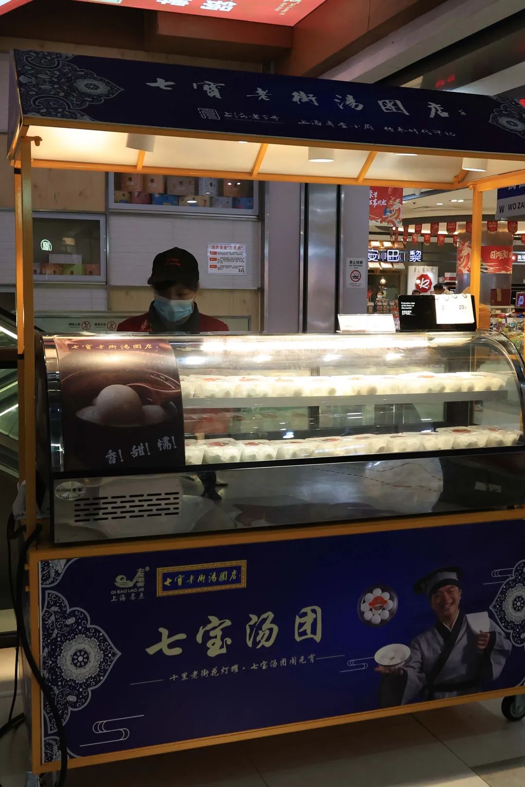 记者看到,在第一食品一楼,七宝老街汤团店摆了一个小推车,专门售卖生汤团,有芝麻汤团、鲜肉汤团两种,均为当日现制现售,方便市民顾客走过路过,顺便捎几盒回家。