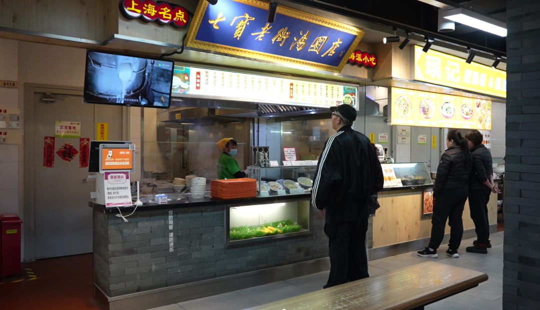 中午十一点,饭点刚到,第一食品杨浦店三楼的七宝老街汤团店已经“忙活”起来。店员手上不停地包汤团,风风火火,动作麻利;锅里不间断地熬煮,热气蒸腾,香气四溢。店前的招牌上,一长串不同口味的汤团明码标价,从枣泥、花生、紫薯,到荠菜、三鲜、虾肉……各种馅料口味兼顾传统与创新。