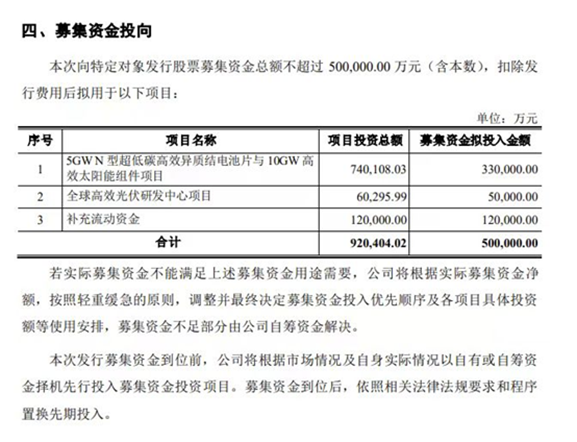 2023年1月,东方日升通过定增募集资金净额49.7亿元,其中33亿元用于5GW异质结电池片项目和10GW高效太阳能组件项目。