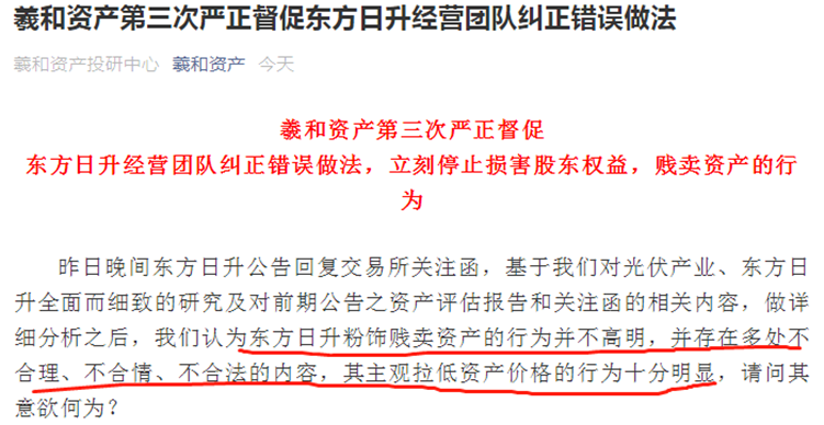 按照自称“东方日升重要机构投资者”羲和资产的看法:“东方日升估值一下子少了一百亿”,并在其公众号连续发布三次公开声明敦促东方日升团队纠错。
