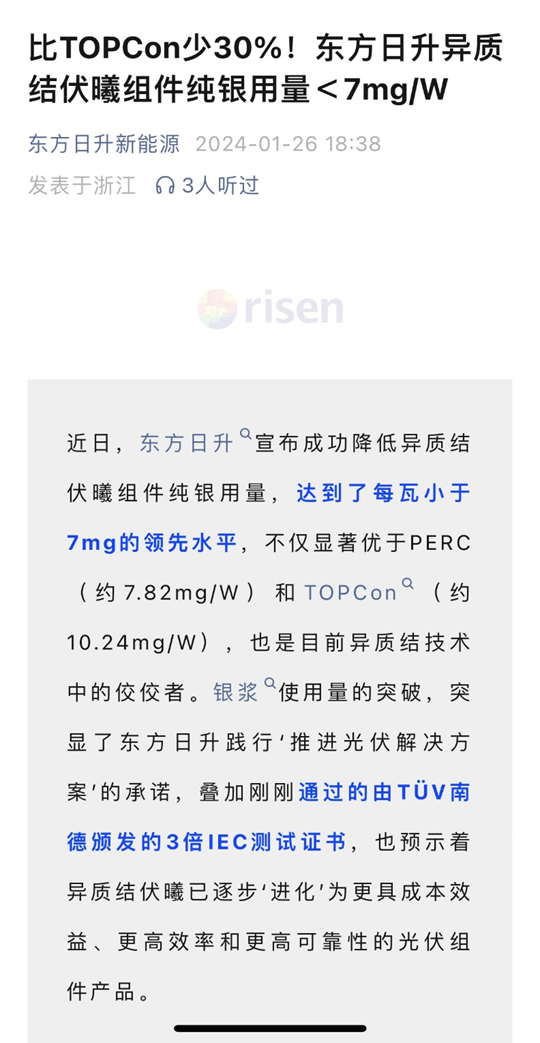 今年1月底,东方日升宣布,已将异质结级组件的单瓦银耗,降至7mg以下。这意味着,其HJT的银耗直接从14mg/W水平下降了一半多。