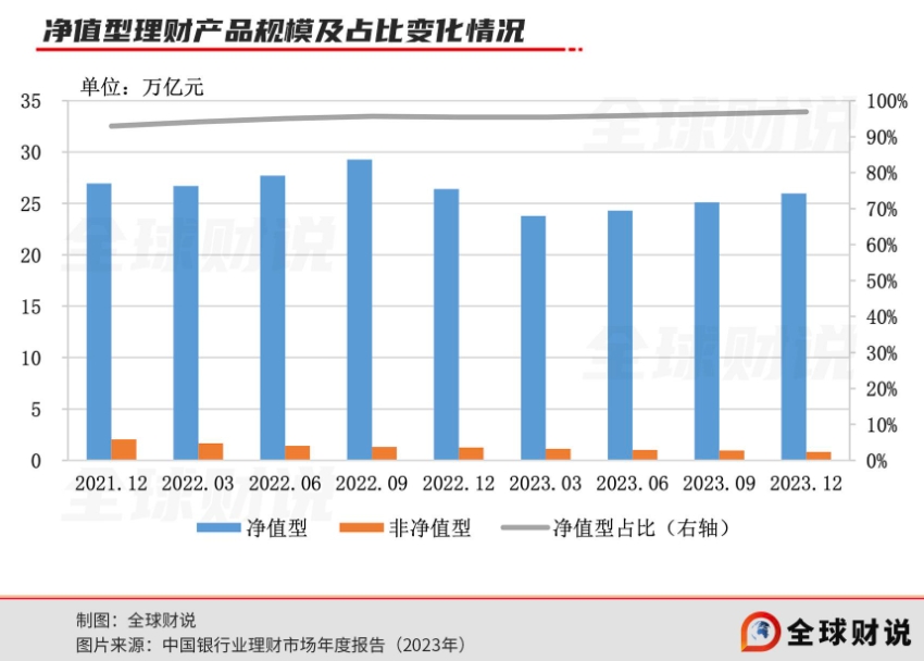 受2018年《资管新规》、《理财新规》两大监管政策驱动,理财产品刚性兑付被打破,产品转向净值化管理,同时禁止资金池运作,截至2023年末,净值型理财产品存续规模25.97万亿元,占比为96.93%,较年初增加1.46个百分点。