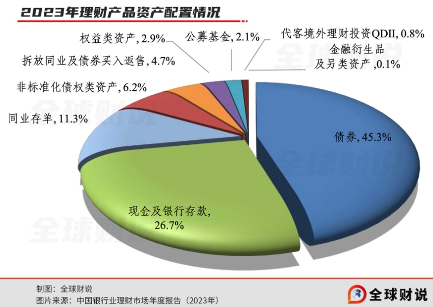 资产端方面来看,根据银行业理财登记托管中心,2023 年年末,理财资产配置结构中,标债+同业存单+非标的规模占比约为62.8%,其次是流动性较好且风险较低的现金及银行存款、拆放同业和公募基金,占比分别为26.7%、4.7%和2.1%,而高弹性的权益类资产占比仅为2.9%。