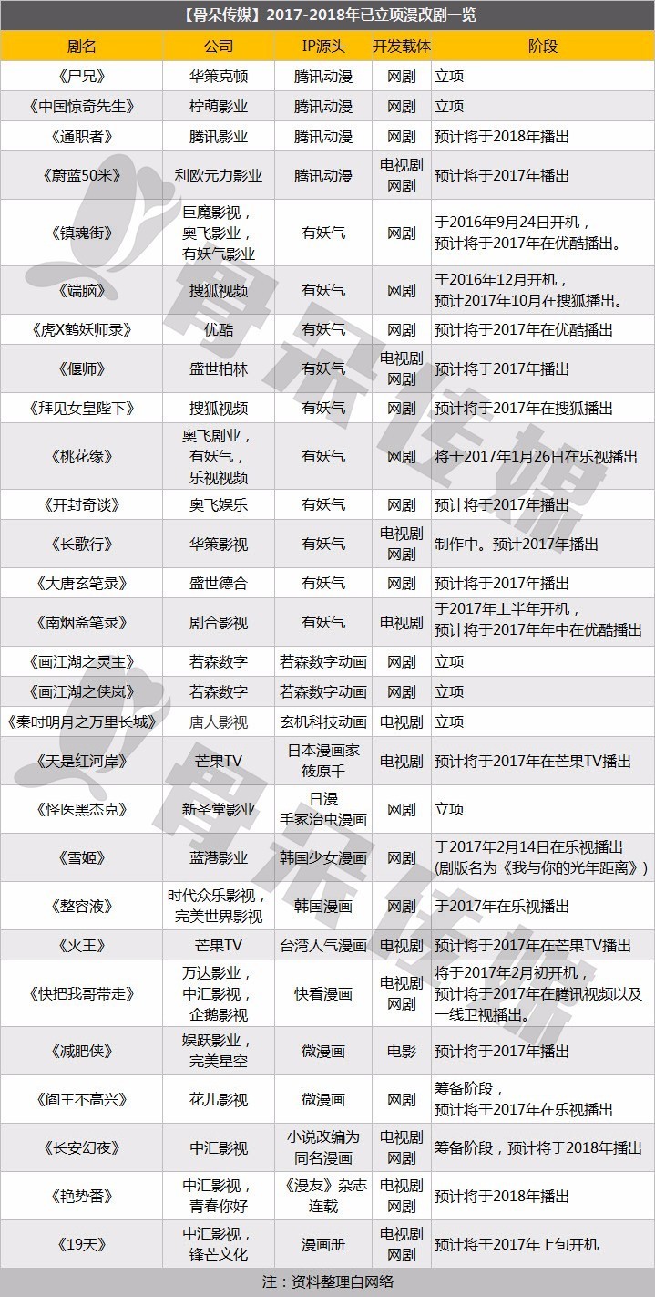 最后,除了国漫以外,日本漫画、韩国漫画也渐渐成为热门IP源头,2016年立项的就包括日本漫画家筱原千的《天是红河岸》,以及韩国漫画《雪姬》和《整容液》。《你的名字》内地票房爆火,近日还传出了中国公司要拍摄真人版的消息,相信未来东亚系的漫画IP会更多地被国内影视公司挖掘。