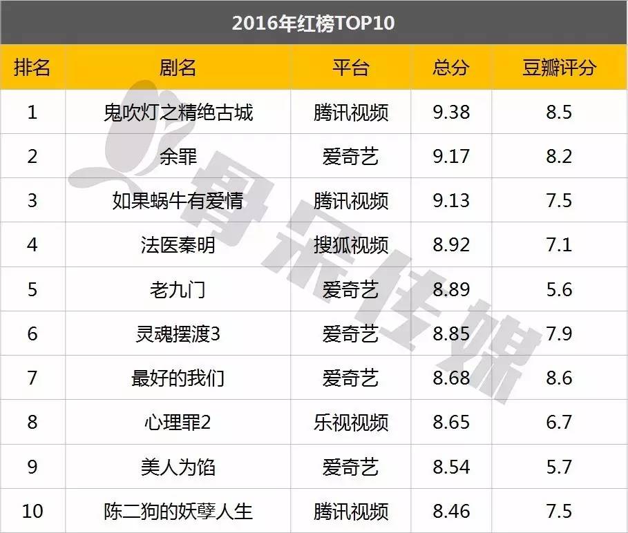 网剧方面,我们以骨朵2016年十大网剧为例: