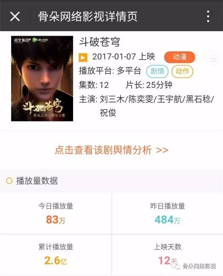 腾讯通过收购盛大文学得到了起点中文网,从而获得了许多网络小说IP、尤其是玄幻架空类头部内容的主导权,而对玄幻题材而言,网络平台显然更为合适。以顶级IP《斗破苍穹》为例,日前,其电视剧版阵容曝光,吴磊担纲男主,引人期待。其同名动画于今年1月7日上映,上映三天播放量已经达到1.5亿,在骨朵网络动漫排行榜上一直遥遥领先,对于剧版将是一个很好的铺垫。