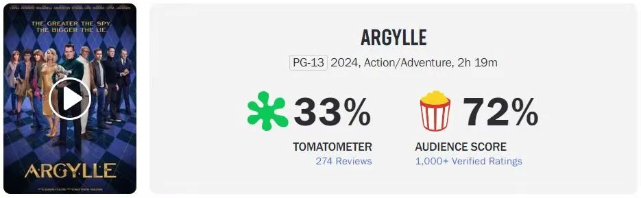 从口碑来看,《阿盖尔》的烂番茄新鲜度低至33%,影评人认为“其错综复杂的情节和过长的运行时间”消弭了趣味性;同时《阿盖尔》的爆米花指数为72%,显示观众对这部间谍惊悚片仍持肯定态度。作为对比,《养蜂人》在烂番茄上的两项指标分别达到70%和92%。在映后环节,《阿盖尔》的CinemaScore评分仅为C+,同样被《养蜂人》(B+)甩在身后。