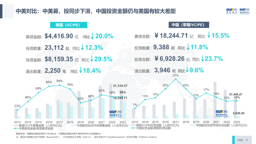 清科研究中心数据显示,2023年,中美募、投同步下滑。从募资金额来看,美国VC/PE募资金额超4416亿美元,同比下降20%;中国股权投资市场募集金额超18244亿元,同比下降15.5%。全球同此凉热。