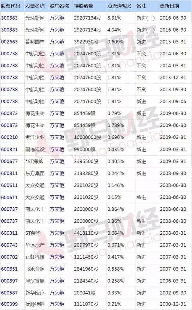 2000年底,“方文艳”因持有111万股抚顺特钢(600399.SH)首次亮相十大股东名单;2002年,再出现一次,然后就消失了整整4年。2006年,“方文艳”复出,现身津滨发展(000897.SZ)、通化金马(000766.SZ)等。2007年1季度,“方文艳”同时出现在华远地产(600743.SH,曾用名:SST幸福)、飞乐音响(600651.SH)、正虹科技(000702.SZ)3只股票的公开信息中。