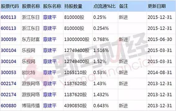 这两年里,章建平现身在6家十大流通股东名单,分别是浙江东日(600113.SH)、东方财富(300059.SZ)、乐视网(300104.SZ)、欧比特(300053.SZ)、游族网络(002174.SZ)和博瑞传播(600880.SH)。