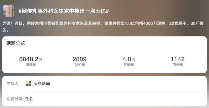 再举个例子。此前“乳腺外科医生家中搜出一点五亿”话题登上热搜,话题共计在榜80分钟,微博数据显示话题阅读量高达8048.2万。该话题主持人“头条新闻”,为新浪新闻旗下官方账号。