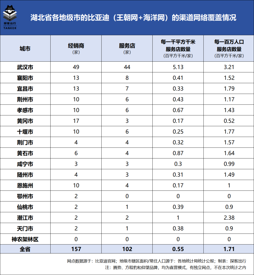 「探客出行」整理湖北省各地级市比亚迪的渠道网点覆盖情况发现,全湖北省的比亚迪经销商网点累计有157家,仅武汉一座城市就占据了49家,占比约31.21%;全省的服务店网点有102家,仅武汉一座城市就占据了44家,占比达43.14%。