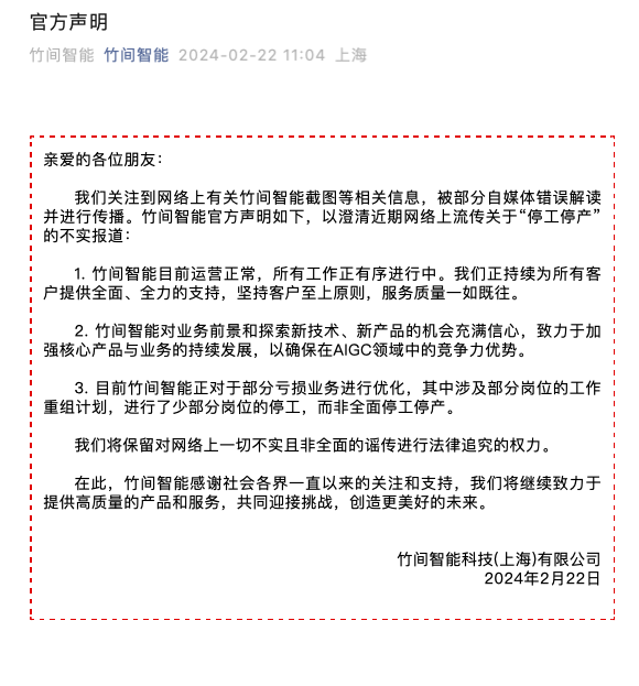 针对此事,竹间智能今日紧急发布《官方声明》称,“停工停产”系错误解读,为不实报道。