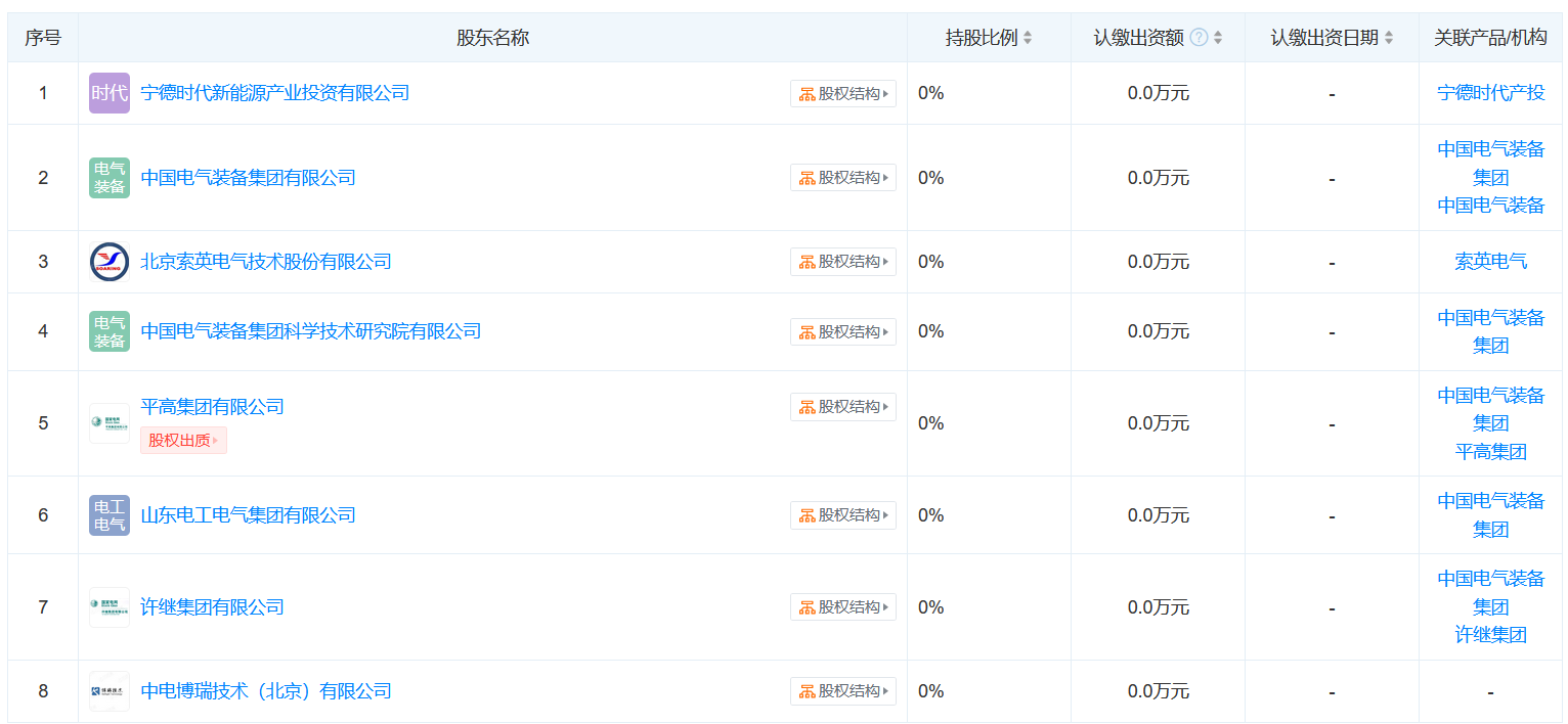 根据天眼查APP信息显示,中国电气装备储能由宁德时代新能源产业投资有限公司、中国电气装备集团有限公司(下称中国电气装备)、山东电工电气集团有限公司、许继集团有限公司等八家公司共同持股。持股具体数据尚未披露。
