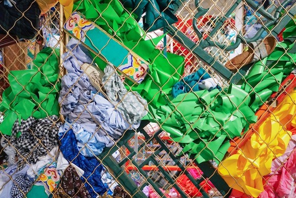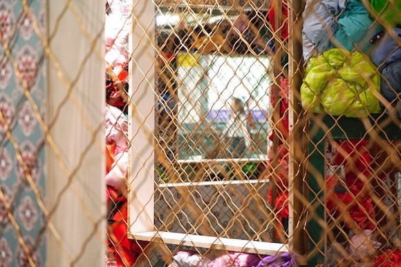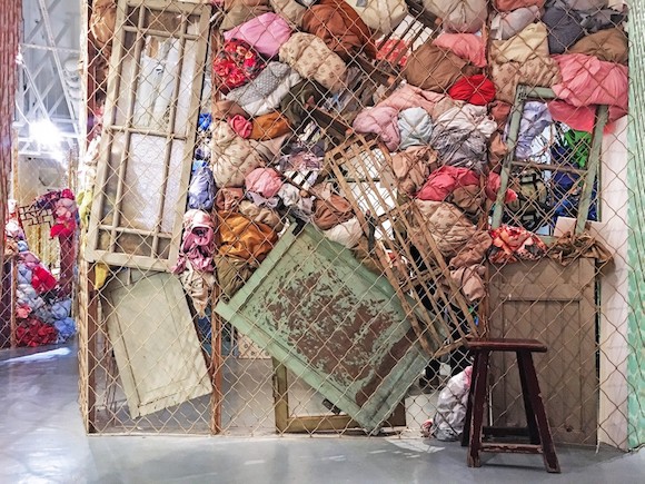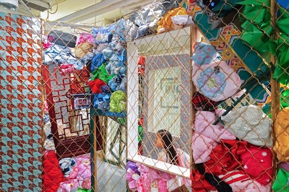 于是,他们把这个在北京办公室内构思出来的故事,在广州搭出了框架,即把防盗网拼接好,又放入了香港的商场进行展览。他们认为这三座城市最能代表巨变。而巨变带来的副作用就是淘汰和丢弃。所以,在搭好的框架里,他们还塞上了从北京胡同找到的四合院残片、广东制衣工厂的边角料和香港露天市场里找到的二手废弃物,填了个满满堂堂。防盗网的镂空,允许迷宫内外的人都能看清废弃物的形态和种类。