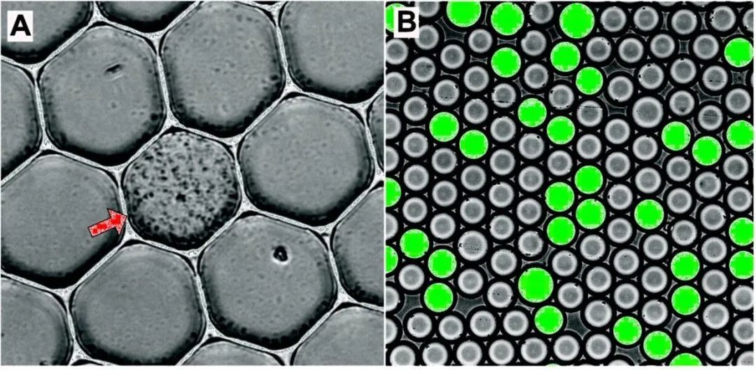 注:微流控技术用于微生物除氟活性研究:使用微芯片,可制备含有细菌的油包水小液滴,体积只有几皮升(一皮升是十亿分之一毫升)。左图A中的箭头指示的是液滴中生长的细菌。右图B中的绿色是细菌进行脱氟反应时液滴发出的荧光。