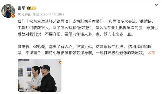 2月22日,雷军在微博宣布,张艺谋成为小米影像首席顾问。