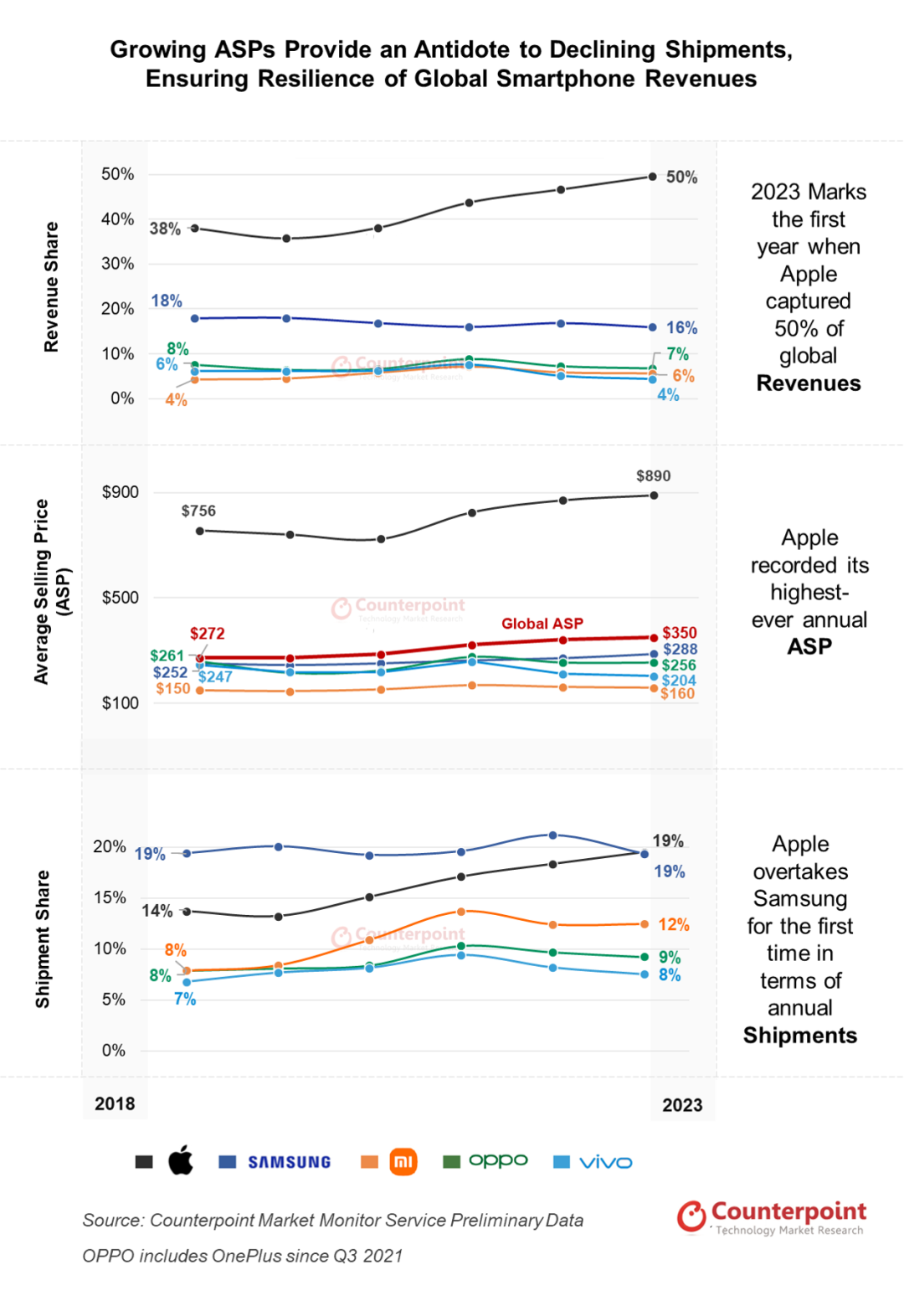 Counterpoint今年2月初发布的数据指出,2023年,从全球智能手机市场收入侧来看,苹果、三星收入占比分别为50%及16%,OPPO、小米、vivo则为7%、6%及4%。其中苹果2023年全球手机出货量占比为20%,以1/5出货量赚取了1/2的收入。