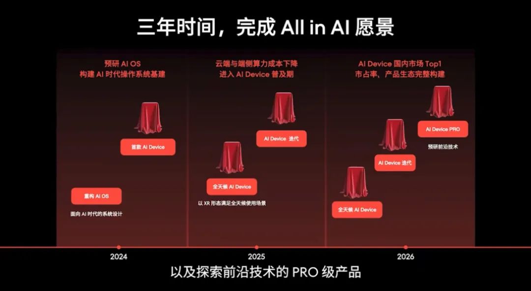 2024年发布首款AI终端设备,重构AI OS;2025年持续迭代AI终端设备,通过XR形态满足用户的全天候使用场景,同时推动云端与端侧算力成本下降,进入AI终端普及期;2026年在国内AI终端设备领域达到Top 1市占率,完成产品生态的完整构建。