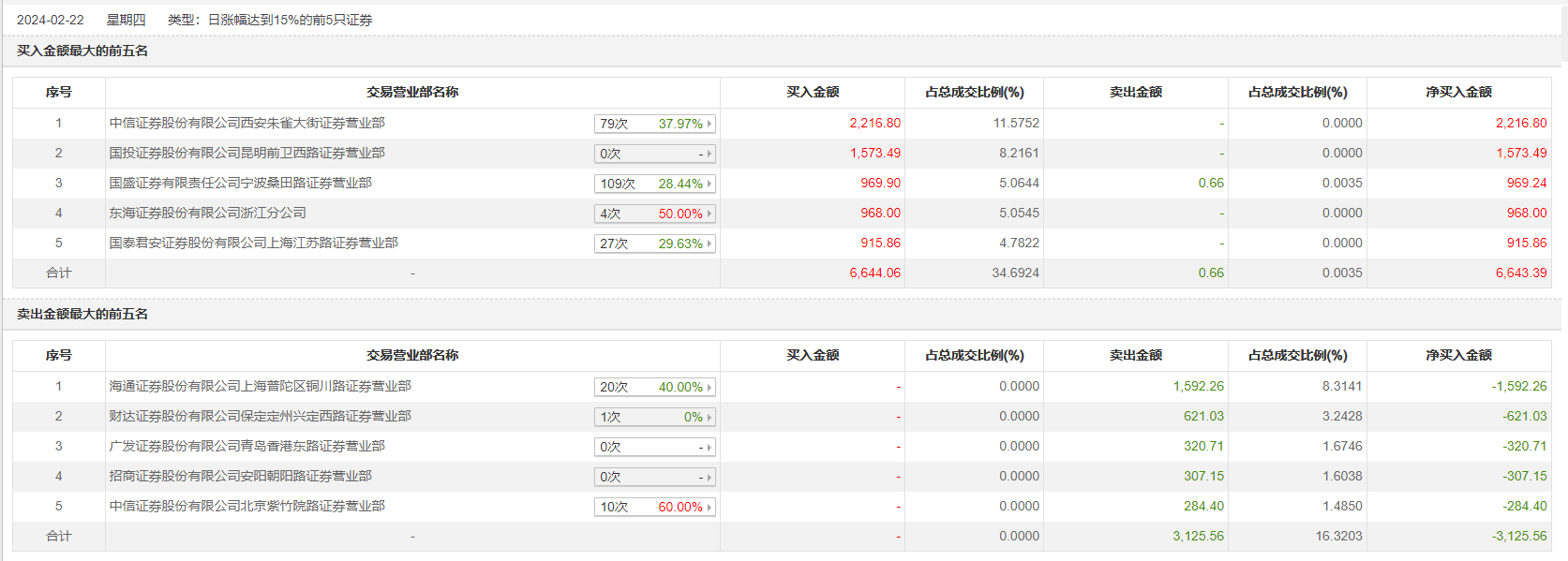 2月22日,森远股份今日涨停,龙虎榜数据显示,上榜营业部席位全天成交9770.28万元,占当日总成交金额比例为51.02%。其中,买入金额为6644.06万元,卖出金额为3126.22万元,合计净买入3517.84万元。