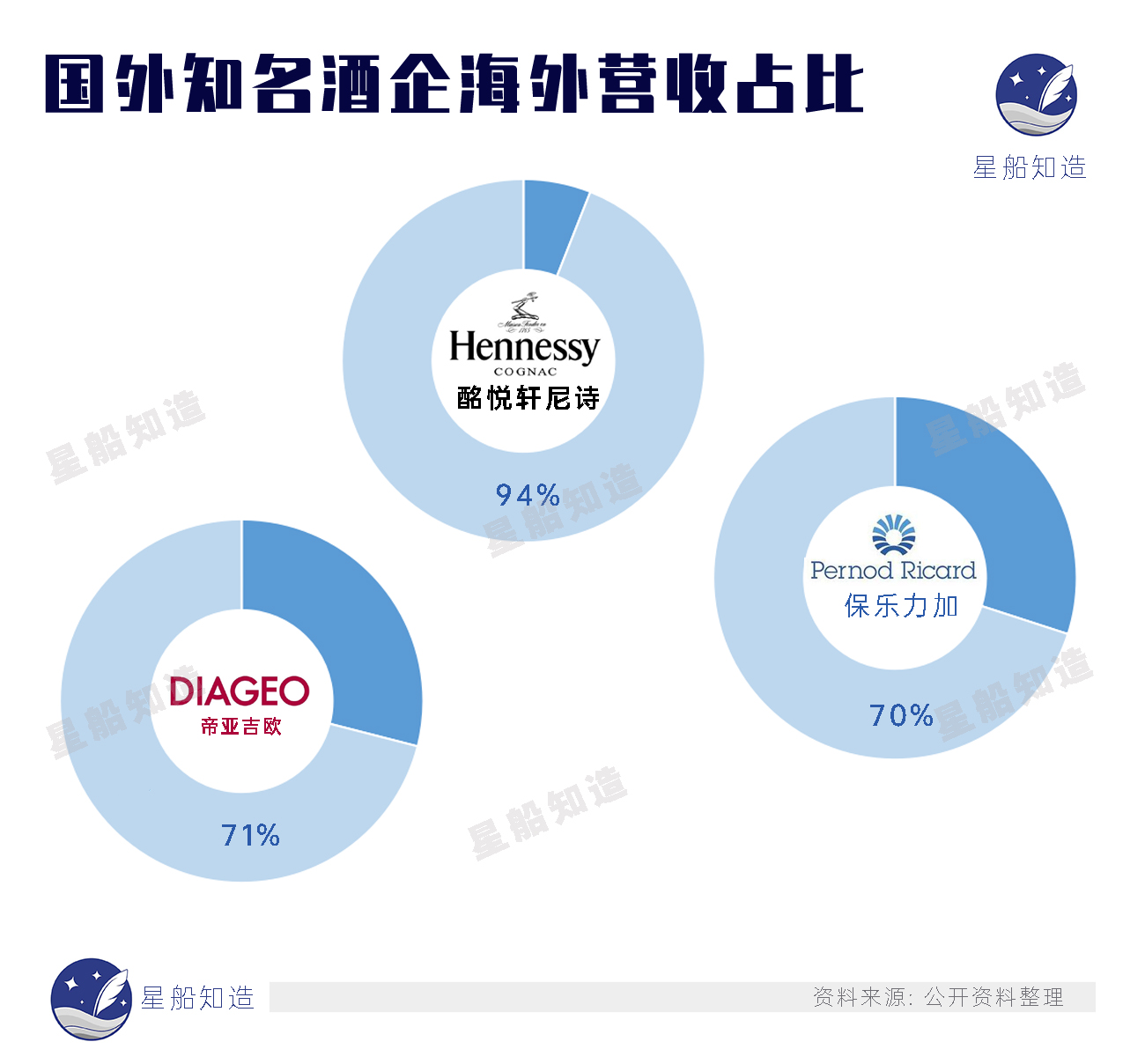 拥有烈酒尊尼获加(Johnnie Walker)的帝亚吉欧、拥有马爹利、芝华士的保乐力加、轩尼诗等国际酒企的海外业务占比均超70%,见下图: