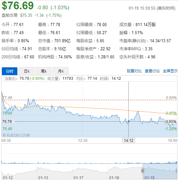 截至1月19日收盘,美国运通股价在纽约证券交易所的常规交易中下跌0.80美元,报收于76.69美元,跌幅为1.03%,每股收益为5.65美元,总市值为701.89亿美元。