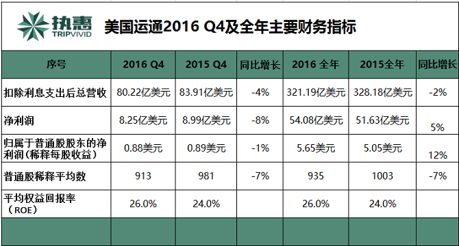 美国运通公司(American Express Company,NYSE:AXP)北京时间2017年1月20日发布了其2016年第四季度及全年财报。财报显示,公司第四季度的稀释每股收益(EPS)为0.88美元,较去年同期的0.89美元下降1%。不计入某些一次性项目,该季度的调整后每股收益为0.91美元。第四季度净利润为8.25亿美元,较去年同期的8.99亿美元下降8%。此外,美国运通第四季度营收为80.22亿美元,较去年同期83.91亿美元下降4%。