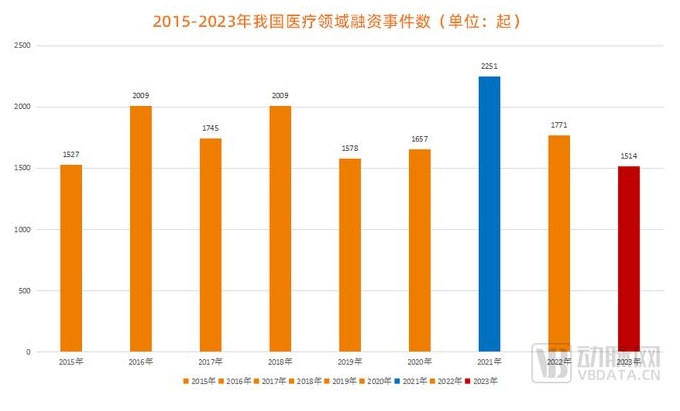 2015-2023年我国医疗领域融资事件数对比(数据来源:动脉橙)