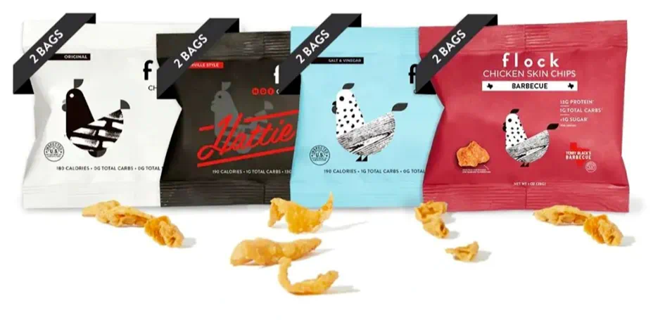 美国超市出售的鸡肉70%是去皮的,Flock Foods利用鸡皮,将其加工成一种生酮友好型、低碳水、高蛋白的新型小零食—鸡片。