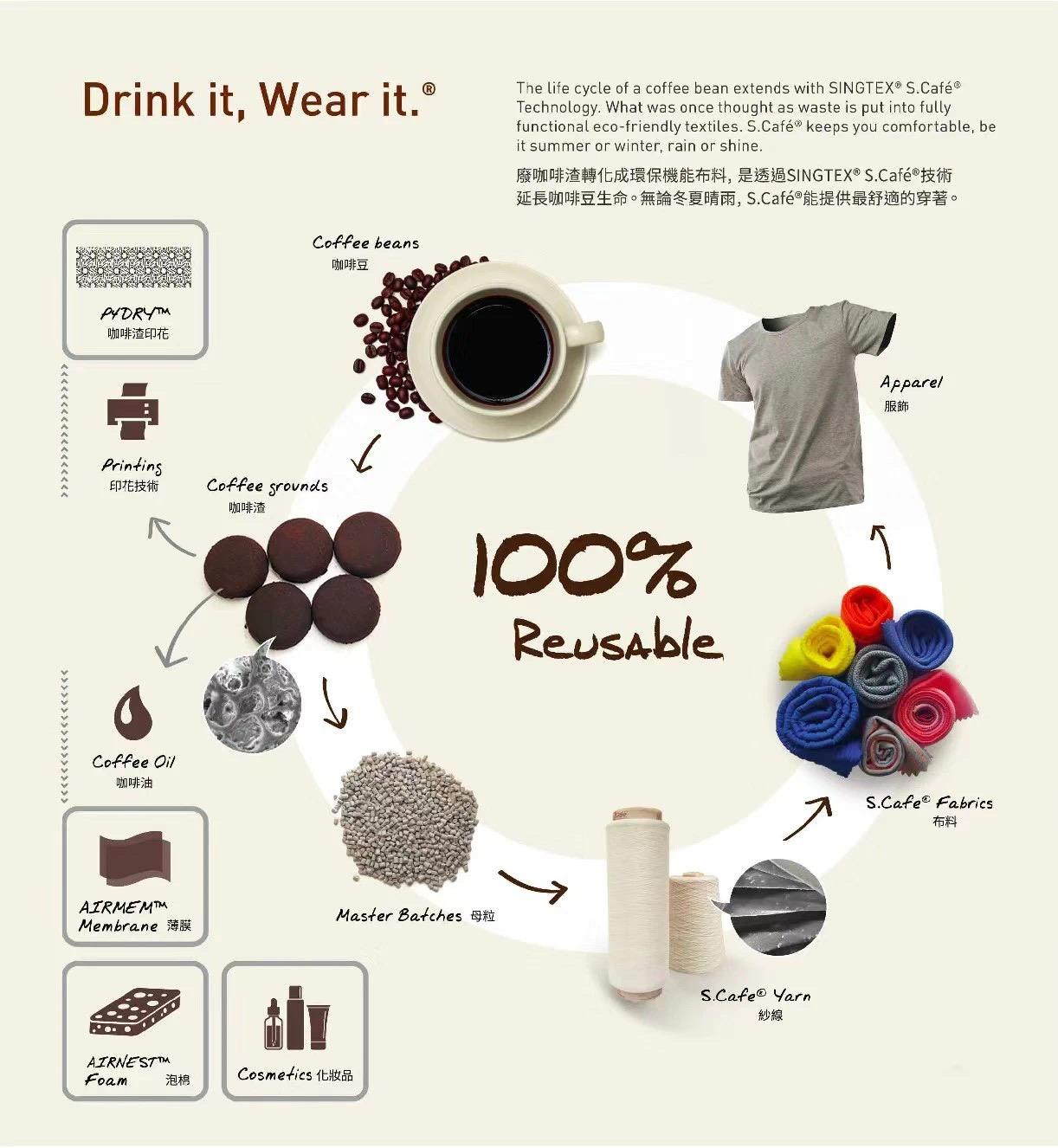 1989年成立的中国台湾羊毛供应商SINGTEX,创新地将咖啡渣融入纱线,打造出一款环境友好的专利纱线—S.Café ,这款专利产品在快速排汗、快干以及防紫外线方面,都有令人羡慕的功能性。