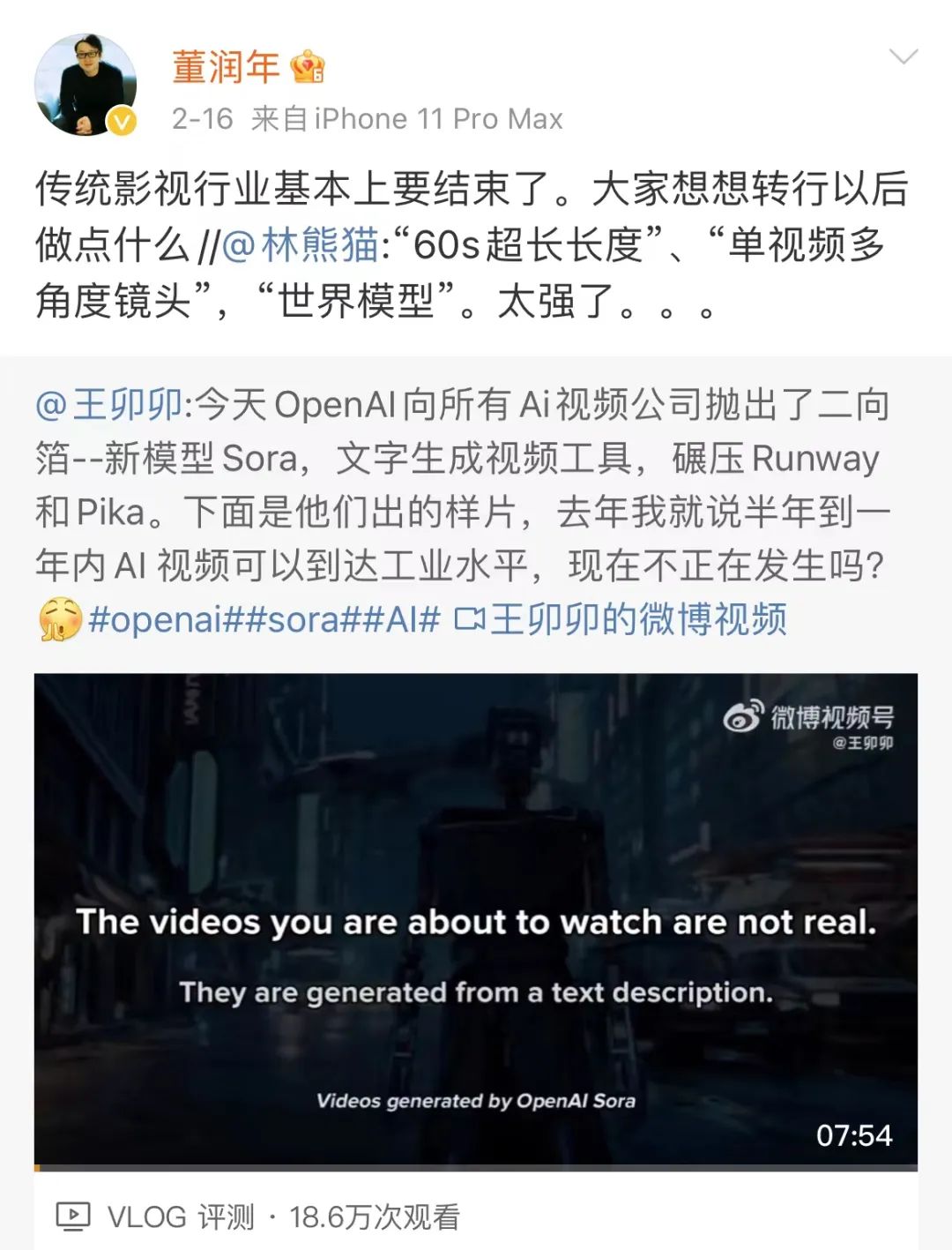 Sora发布不到12小时,导演郭帆在朋友圈转发了相关链接并感叹“太快了……”。尽管现在还不能“一键”生成《流浪地球3》,但是《流浪地球10》,并非没可能。