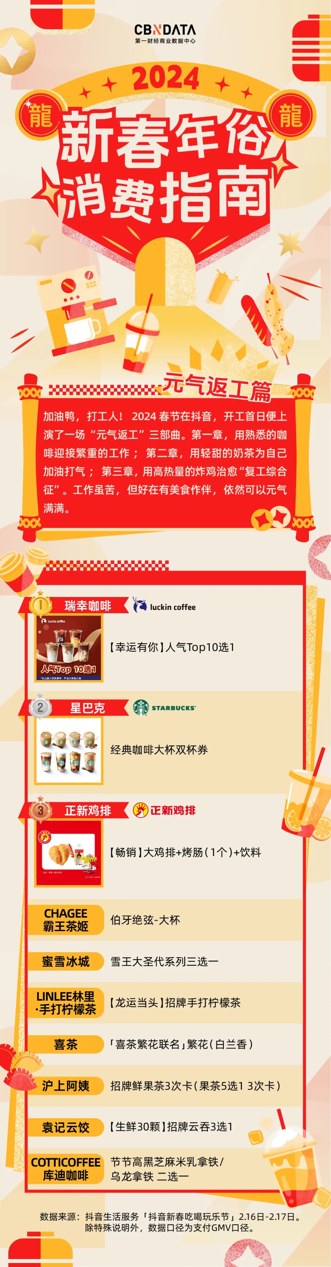 应对“节后综合症”的最后一招,是用高热量的炸鸡炸串为自己加油打气。酥脆的炸串不仅唤醒了味蕾,更在无形中提振了精神。当身体补足能量,自然能元气满满迎接复工,毕竟开工虽苦,至少还有美食作伴。总的来说,茶饮、咖啡、炸鸡三件套成为缓解复工不适的灵丹妙药,而打工人在“元气返工日”的消费选择,既是一种生活态度的体现,更是对品牌忠诚度和产品品质的一次投票。