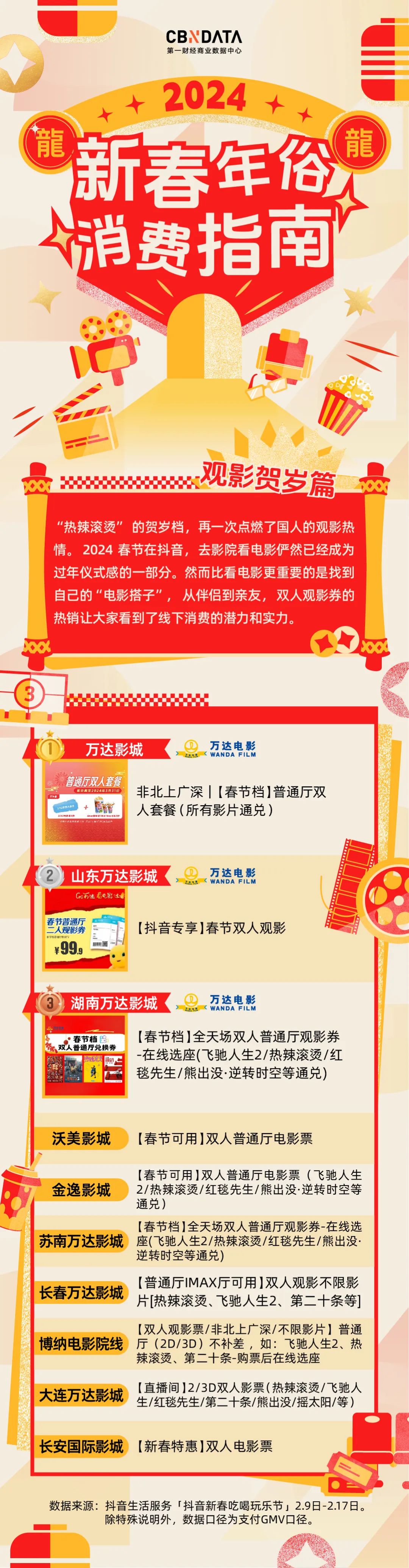 另外,榜单前三名都位于非北上广深地域,背后折射出的是三四线城市蓬勃的观影需求。根据《2024春节档电影数据洞察报告》,今年春节档三四线城市票房占比增长至58.9%,成为电影消费主力军。从价格上看,单张电影票价在40-60元区间浮动,消费者愿意为优质的电影内容和体验买单。当前,三四线城市新开影院的数量不断增加,居民对生活品质的追求也在不断提升,下沉市场正预计为电影行业带来新的增长机遇。