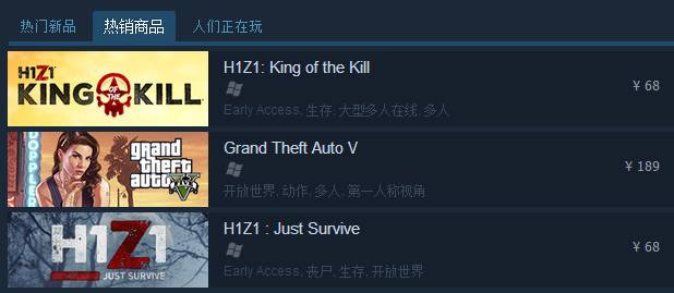 目前《H1Z1:King of the Kill》已经达到了362万的销量,近期《H1Z1》的两款游戏一直在中国热销榜Top5。就在上周《H1Z1:King of the Kill》终结了《侠盗猎车手5(GTA5)》Steam周销量榜连续四周的冠军。