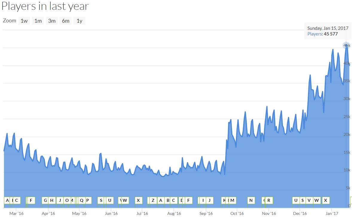 根据steamdb的数据,《H1Z1:King of the Kill》虽然开始一直呈下降状态,但在2016年9月的一次更新之后,在线人数开始回暖,前段时间2017年1月15日,甚至突破了同时在线人数4.5万人的大关。