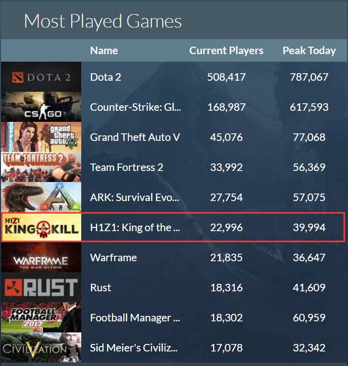 根据steamdb的数据,《H1Z1:King of the Kill》目前在Steam全球最火的游戏里排名6。当前在线人数2.2万、最高在线人数3.9万。