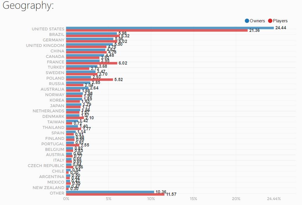 根据steamspy的数据,以拥有者来查看(避免中国玩家用VPN而被算至其它国家),中国大陆的玩家约占4.97%,而剩余的95%都是海外玩家。致使结伴“打老外”一度成为该游戏最大的乐趣——当然这是对于中国玩家而言。