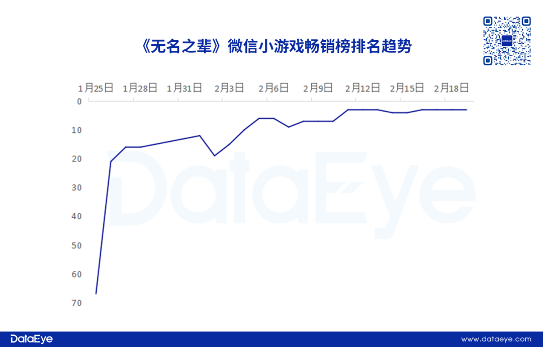 节前飙升,春节假期稳居TOP3。DataEye研究院数据统计,《无名之辈》在1月25日才进入微信小游戏畅销榜,而且排名第67名,随着产品买量投放(下文详细分析)排名明显飙升。