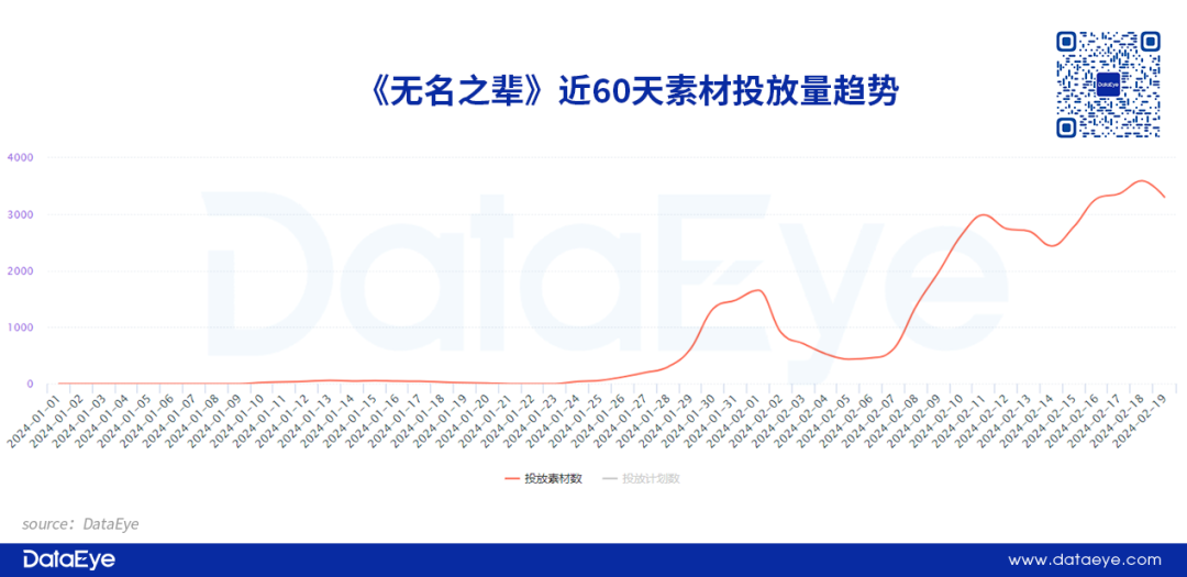 另一方面自家产品让步。通过投放数量来看,三七旗下另一款《灵魂序章》的投放素材量在春节前后有明显的下滑,或许就是给新品腾出更多资源,为其爆发进行让道。