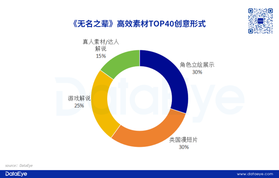 DataEye研究院整理了《无名之辈》投放计划数TOP40高效素材的创意形式,主要分为4种类型,分别是角色立绘展示、类国漫短片、游戏内容解说以及达人/真人素材。