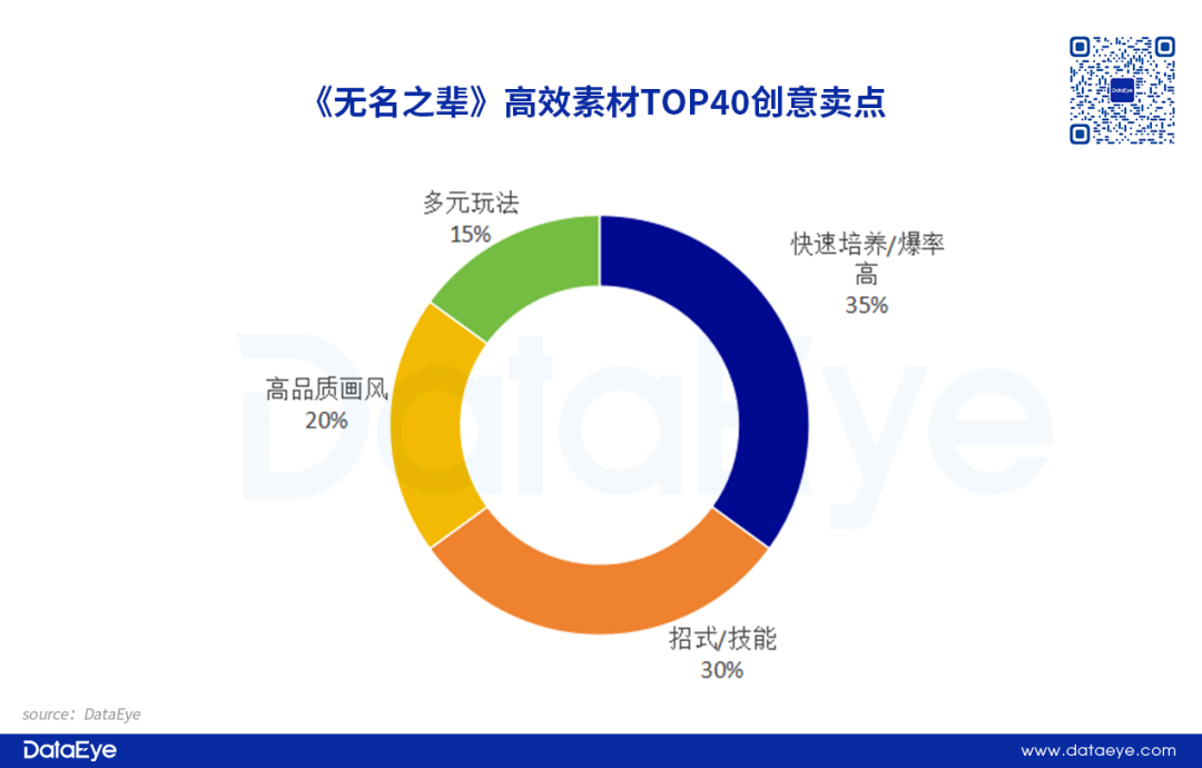 其中快速培养/爆率高元素占比最高,约为35%。这类型素材主要展示开箱子玩法的装备获得简易度(高爆率),能快速培养角色,以体验游戏的“休闲”属性,是开箱子品类产品相对传统的卖点之一。