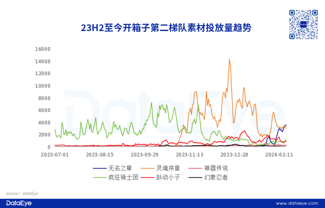 正是由于越来越多厂商的入局,加上《疯狂骑士团》在23年Q4投放素材量下滑,给了其他开箱子小游戏产品机会。紧接着《灵魂序章》去年Q4起量,而《无名之辈》在今年Q1崛起,《幻象忍者》则从2月11号开始跌出畅销榜,赛道新旧交替明显,多款产品的形势变化都让这一赛道进行了小幅度洗牌。