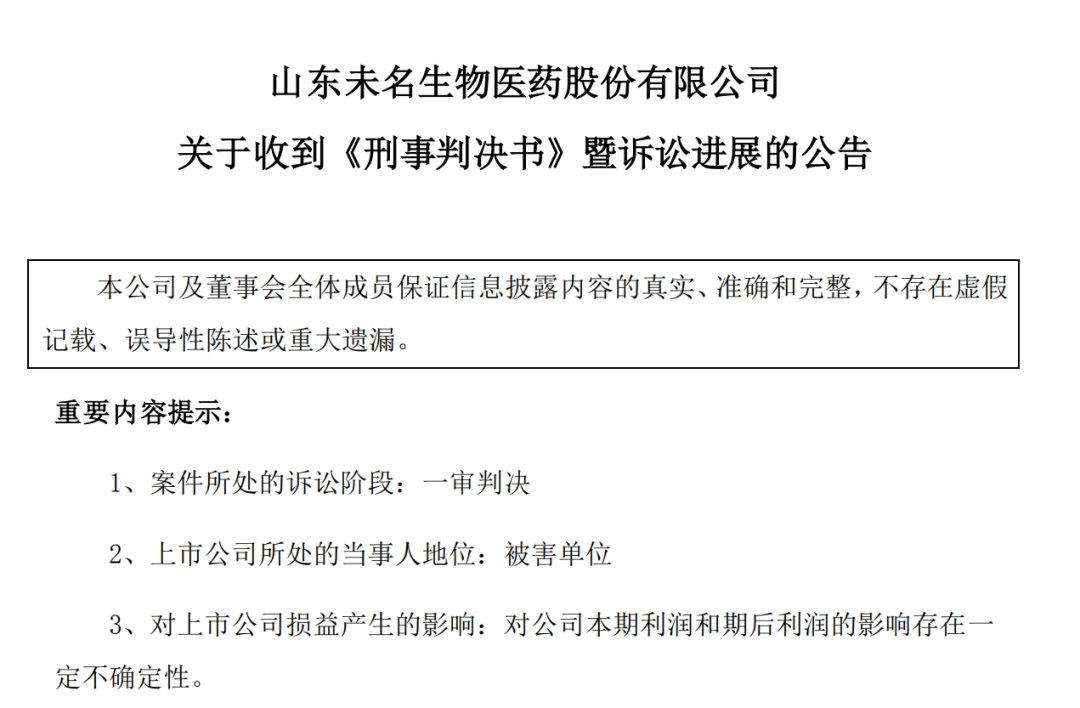 2月19日,未名医药公布了一封《刑事判决书》。山东淄博市张店区人民法院一审认定,潘爱华、罗德顺利用职务便利,与李鹏飞将未名医药财务非法占为己有,行为构成职务侵占罪;潘爱华、罗德顺还挪用单位资金归个人使用,构成挪用资金罪。