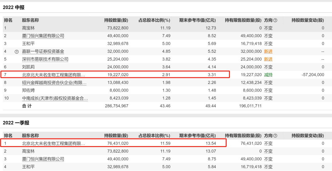 公开数据显示,截至2022年一季度,未名集团还是未名医药大股东,持股比例11.59%;至2022年年中,未名集团持股比例已降至2.91%,仅为第七大股东。
