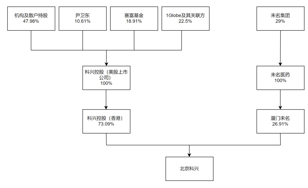 起初,潘爱华实控的未名集团是北京科兴的大股东;但为了给北京科兴赴美上市铺路、搭建红筹架构,未名集团将大部分股权让渡至尹卫东持股并担任董事长的科兴控股名下,改为以签署备忘录,约定未名集团享有对北京科兴10项重大事项一票否决权,以及董事长、法定代表人的永久委派权利的方式,实控北京科兴。