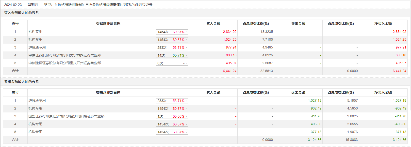 具体来看,机构买入4158.27万元,卖出1685.99万元,合计净买入2472.28万元。此外,沪股通专用、中信证券东阳吴宁西路证券营业部分别买入977.91万元、809.10万元;沪股通专用、国盛证券长沙星沙向阳路证券营业部分别卖出1027.18万元、411.70万元。