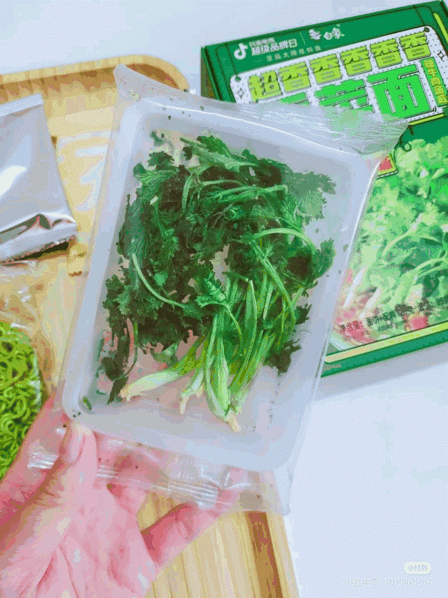 不只是从产品名称凸显香菜的“多”,产品也不吝惜对香菜的使用。如白象的“超香香香香香香菜面”,“香菜面”前有5个“香”,蔬菜包里就放5棵新鲜香菜,主打一个“图片与实物相符”。